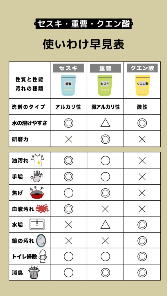 このページでは、それぞれの洗剤の特性をできるだけ分かりやすく解説し、確認用として使える早見表をまとめました。