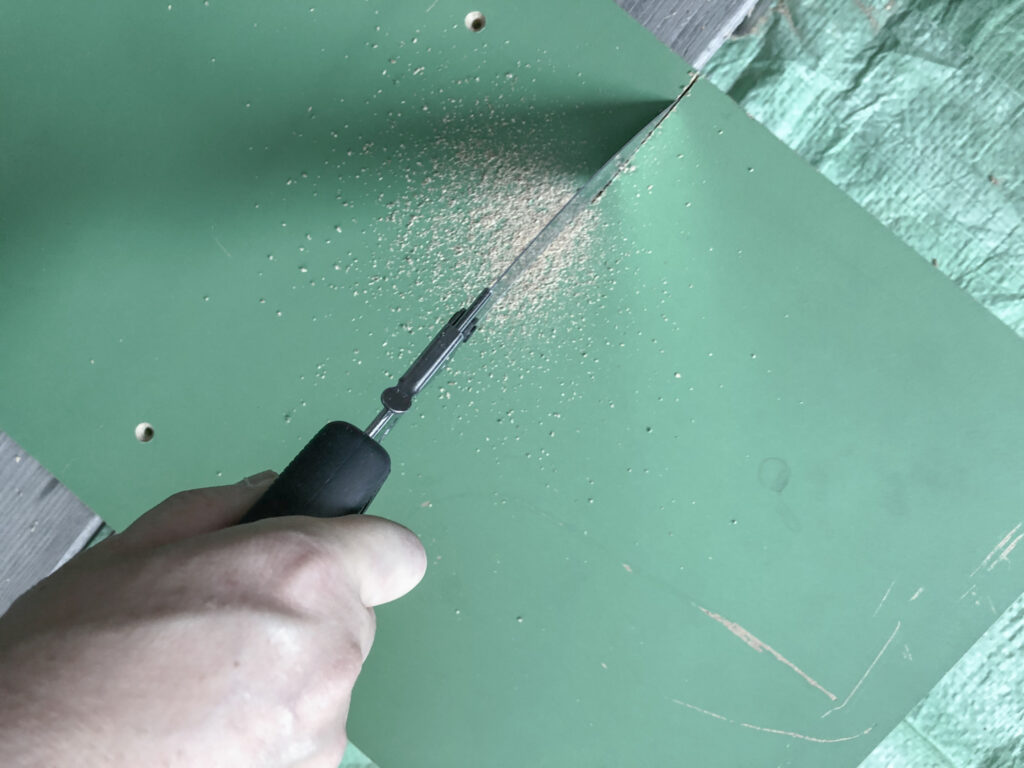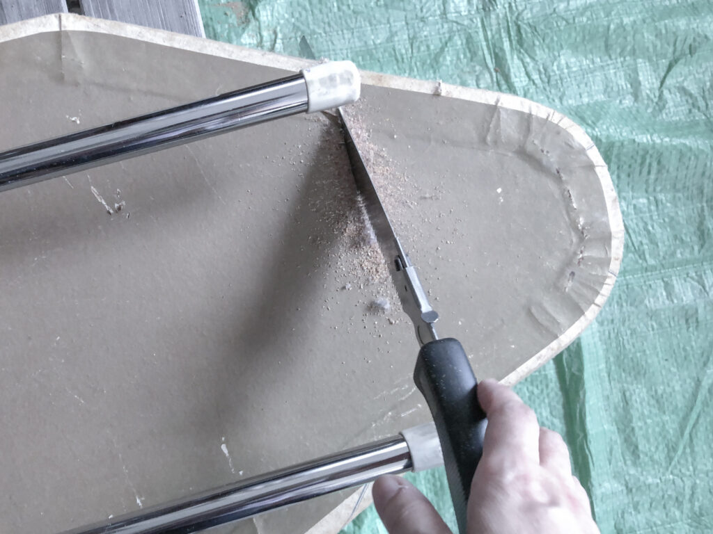でも、切れやすい角度があって、力を入れないで楽にのこぎりを動かせる角度を探しながら切っていくと、カラーボックスよりは時間がかかりますが、アイロン台も女性でもちゃんと解体することができました。